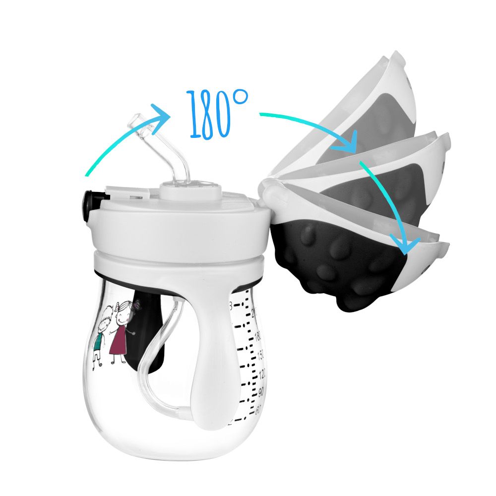 Bidon z silikonową słomką zakończoną odważnikiem umożliwia picie pod każdym kątem. Wykonany z nowoczesnego tworzywa – TRITANU, całkowicie wolny od bisfenolu A (0% BPA). Technologia ta powoduje, że bidon się nie rysuje i nie przebarwia. Jest bardzo odporny na uszkodzenia, a wyglądem przypomina szkło. Dziecko pije do ostatniej kropelki. Twój maluszek może pić przechylając kubek nawet do góry nogami. Niezastąpiony w domu i w podróży. Szczelne zamknięcie zapobiega wylewaniu się picia i chroni słomkę przed zabrudzeniem. Wygodne otwieranie poprzez naciśnięcie guziczka. Transparentność i wyraźna podziałka pozwala na kontrolowanie ilość płynu. Kubek można myć w zmywarce na górnej półce (ale bez słomki). Pojemność 250 ml