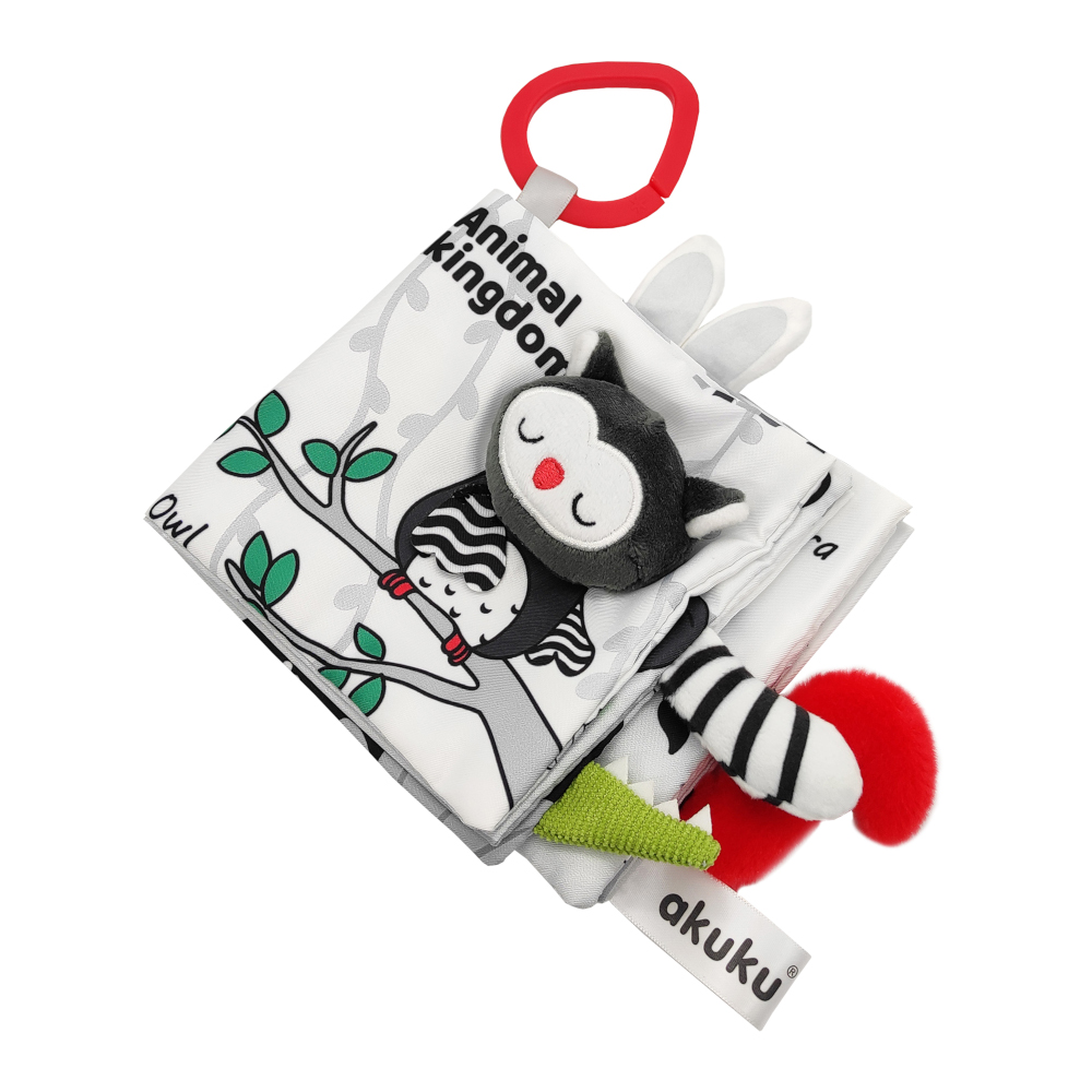 Kontrastowa książeczka sensoryczna Królestwo Zwierząt to świetna zabawka dla najmłodszych dzieci, które dopiero uczą się poznawać świat. Jest pełna niespodzianek, które zaciekawią Twojego maluszka. Pobudzenie zmysłu dotyku wpływa na prawidłowy i harmonijny rozwój Twojego dziecka. Znajdziesz w niej materiały o różnych fakturach i właściwościach, takie jak piszczek, grzechotka oraz elementy szeleszczące i liczne wypustki. Zabawka wspiera rozwój maluszka już od pierwszych dni, stymuluje wzrok dzięki specjalnie zastosowanym kolorom, które niemowlę widzi od urodzenia. Doskonale pobudza rozwój koordynacji wzrokowo-słuchowej i motorycznej dziecka. Jest idealna do nauki chwytania i odkrywania ciekawych dźwięków i kształtów. Praktyczny zaczep umożliwia przypięcie zabawki przy wózku lub łóżeczku. Jest delikatna i miła w dotyku.