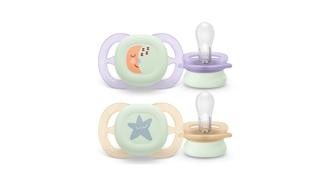 Tarcza smoczka Philips Avent Ultra Start na Noc delikatnie świeci w ciemności. Dzięki temu łatwiej jest znaleźć smoczek noworodka, gdy zgasną światła.