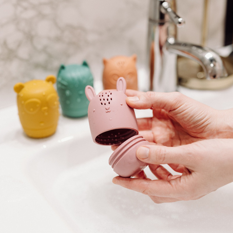 Zestaw 4 uroczych zabawek do kąpieli w różnych kolorach i fakturach umili każdą kąpiel. System otwierania zabawek pozwala na ich dokładne umycie i wysuszenie w środku, zapobiega gromadzeniu się brudu i powstawaniu pleśni.