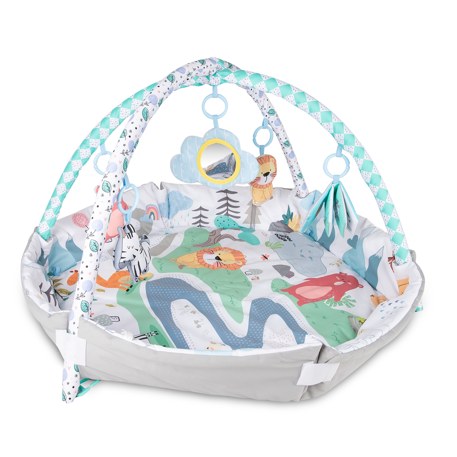 Edukacyjna mata do zabawy SAFARI to rozwiązanie 3w1, które rośnie razem z dzieckiem i może służyć jako kojec, mata edukacyjna z zabawkami na pałąkach lub po prostu mata bez dodatkowych akcesoriów. Tak wiele możliwości sprawia, że mata zachęci dziecko do zabawy na długi czas.