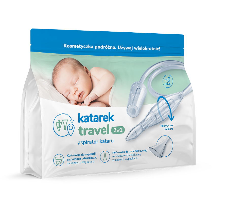 Aspirator Katarek Travel to urządzenie, dzięki któremu skutecznie, szybko i bezpiecznie odciągniesz zalegający w nosku dziecka katar.