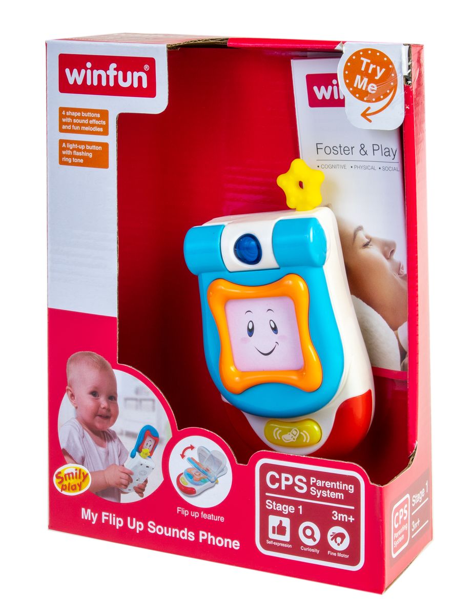 Telefon to doskonała zabawka zachęcająca do gaworzenia i wypowiadania pierwszych słów. Uśmiechnięty Telefon zajmie dziecko na dłuższy czas. Ma ruchomą klapkę, gra melodyjki i miga światełkami, dzięki czemu rozwija zmysły dziecka. Po otworzeniu klapki dziecko zobaczy bezpieczne lusterko, w którym będzie mogło przeglądać się i uczyć rozpoznawania własnego odbicia. Antenka to gryzak, który szczególnie zainteresuje ząbkujące dzieci.